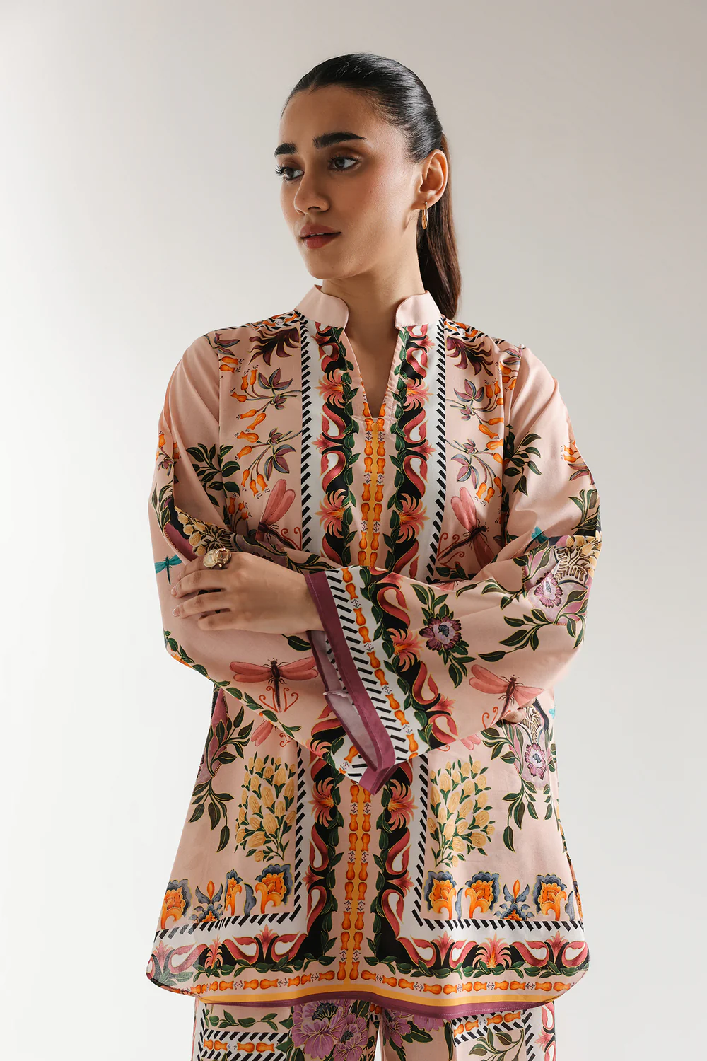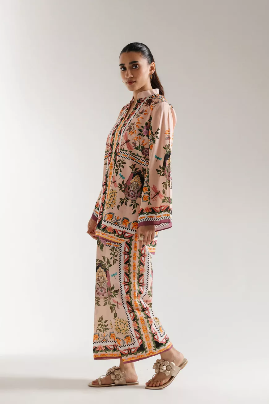 "Women's light pink artistic print co-ord set – ban neck short shirt with V-slit and straight culotte trousers in cotton viscose fabric" Light Pink Artistic Print Co-o...