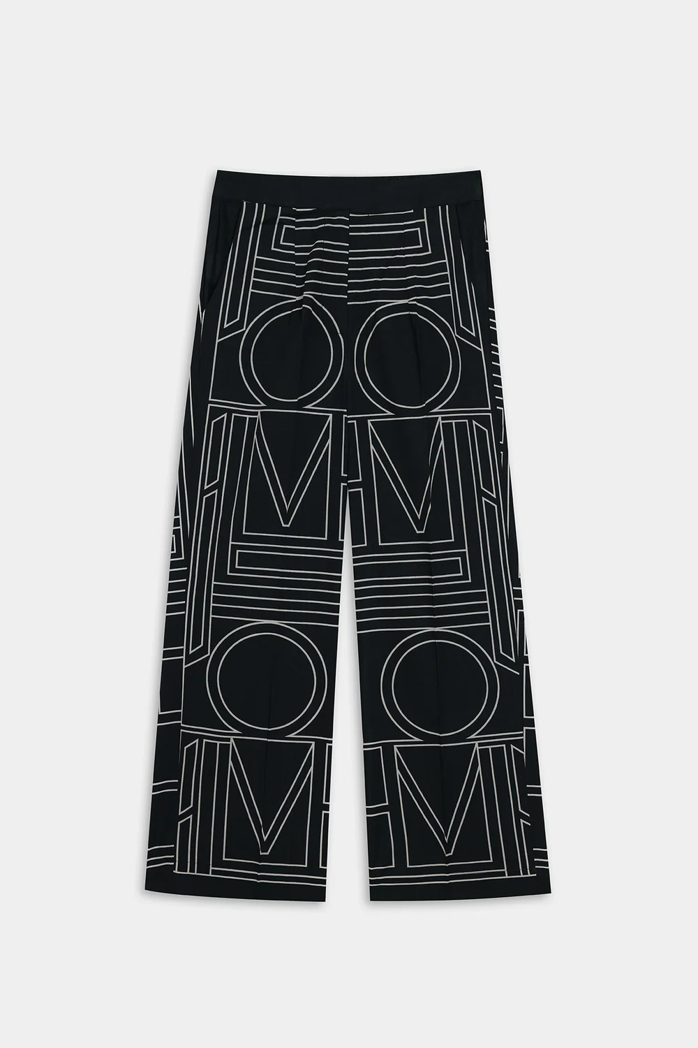 A striking work of art is depicted on this modern outfit, presented in a deep black hue and displaying a geometric patterned design in contrasted white color. It showcases a stylish top designed in a sophisticated button-down style with a ban neckline. Paired with complementing straight pants, this refined ensemble is perfect for social gatherings and events this season.