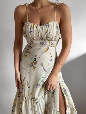 Μπεζ φορεμα με λεπτομερεια στο στηθοςκαι σκισιμο