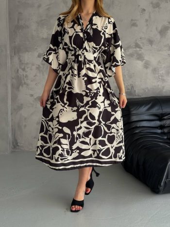 Midi ασπρομαυρο βισκοζ φορεμα με ζωνη