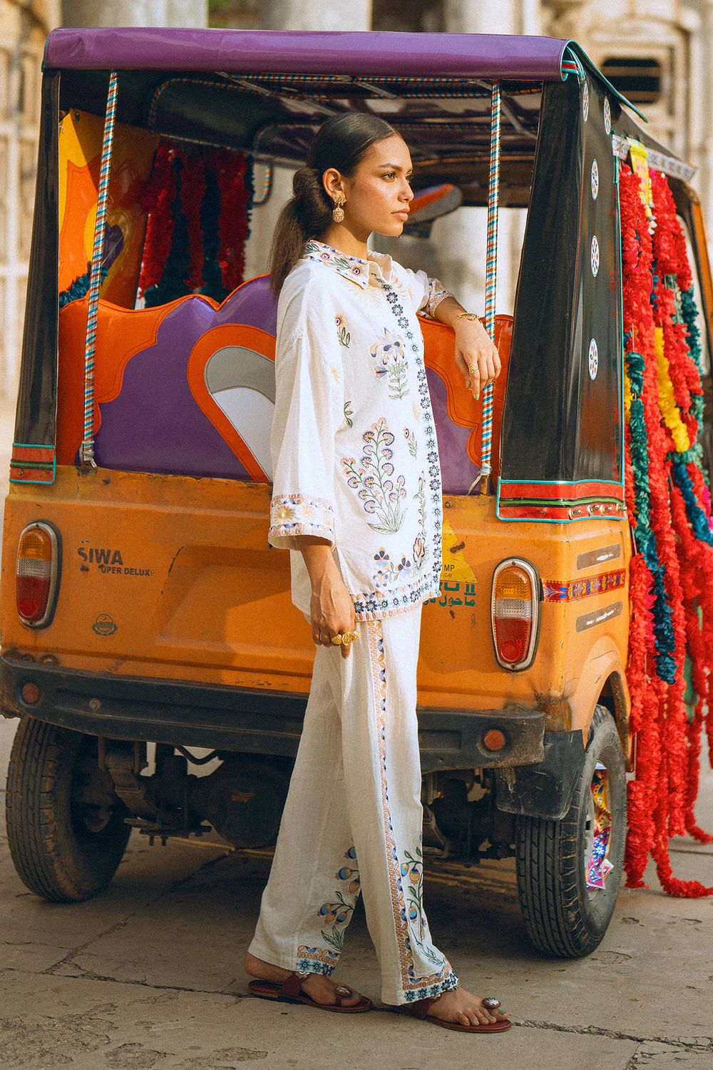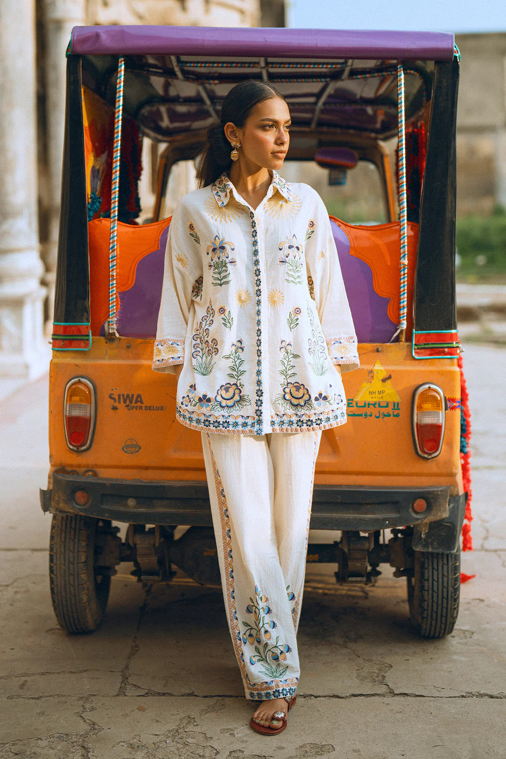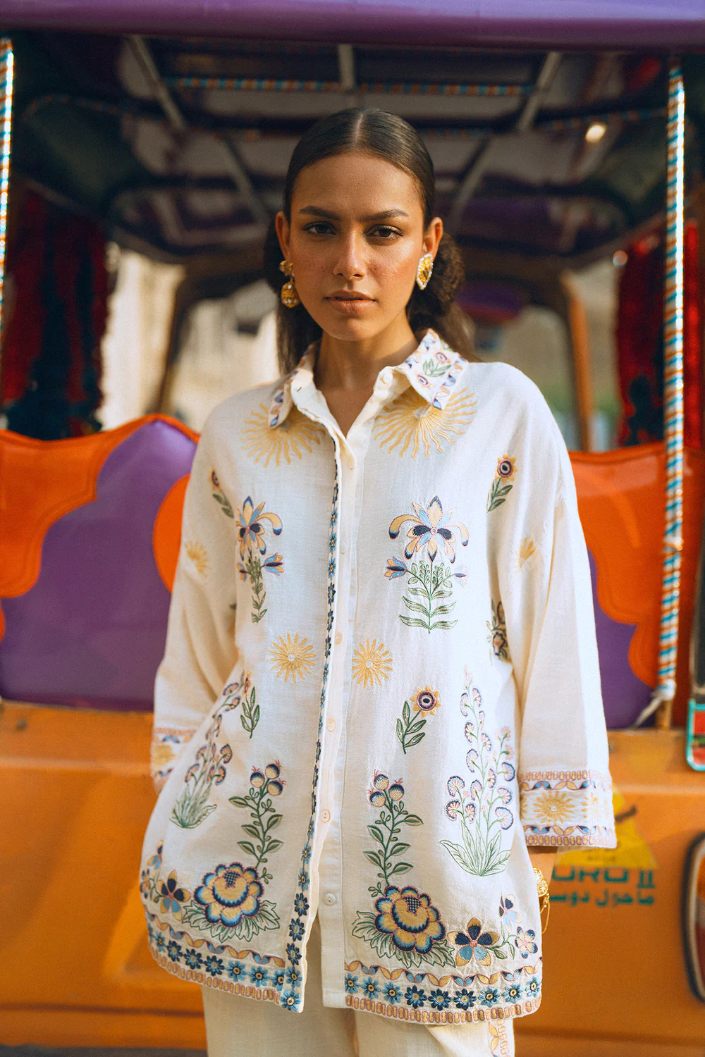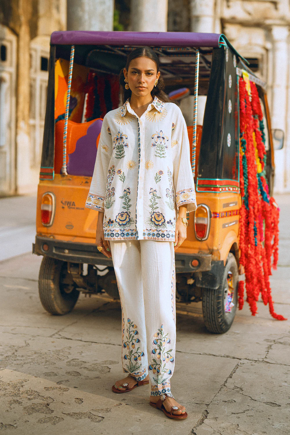 Crafted with full sleeves and a relaxed fit for all-day comfort, the look is completed by matching trousers with delicate floral embroidery along the hem. Effortlessly chic and ideal for festive gatherings or special occasions.